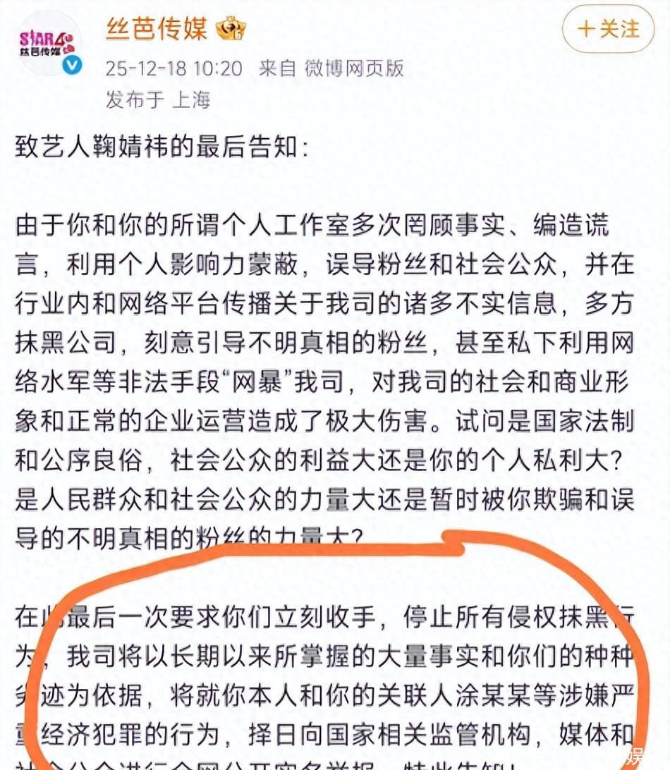 另外,鞠婧祎方还指控丝芭传媒长期串通关联公司,用签“双重合同”的方式隐瞒演艺收入的真实金额,截留、侵占本该属于她的收入。就在双方围绕合约问题多次举证、互相交锋的时候,丝芭传媒发布的这份“最后告知”让事件彻底升级了。