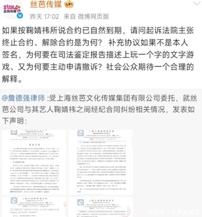 而鞠婧祎方面明确说,她和丝芭传媒的合约已经正式到期了,所以不打算再续约,想自己独立发展。但丝芭传媒这边坚决不认可这个说法,还公开表示,双方的合约有效期要月,并且拿出年签订的《补充协议》当核心证据,说这份协议里明确约定了合约期限顺延。